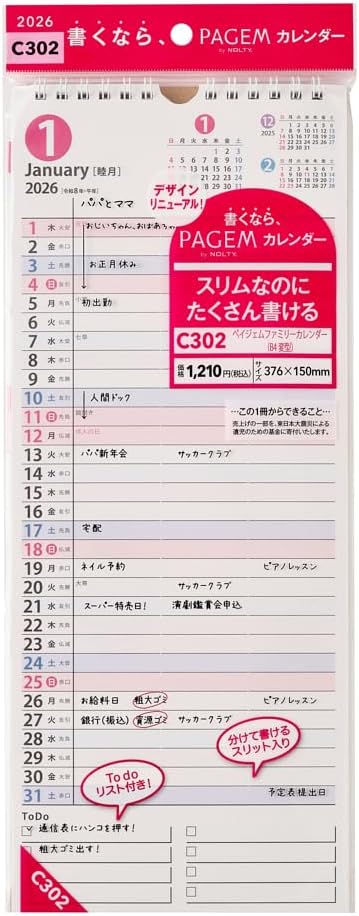 Other Calendar published by JMA Management Center. PAGEM by NOLTY Family Calendar series (ring-bound). Slim B4 variant that fits in narrow spaces l...