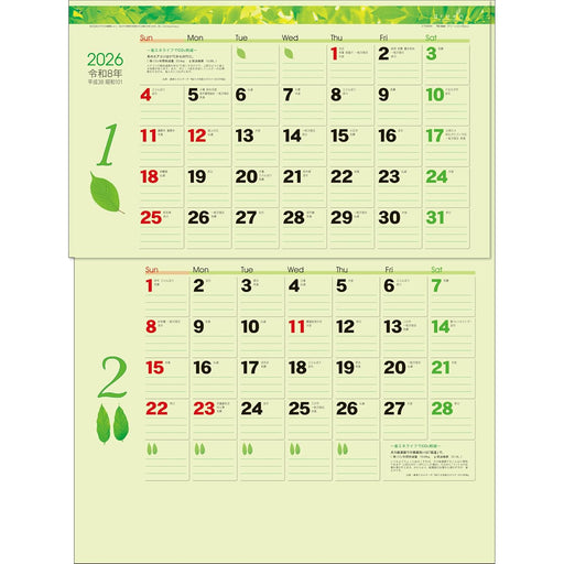 Todan 2026 Wall Calendar Green 2-Month eco (Perforated 15 Months / Date Markers) 53.5 x 38cm TD-30944