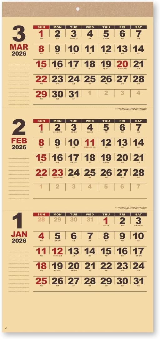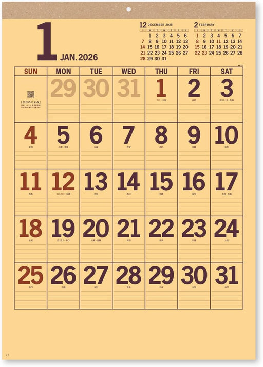 New Japan Calendar 2026 Wall Calendar Color Kraft Memo NK171