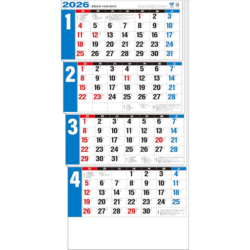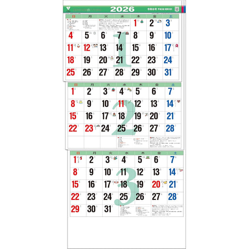 Todan 2026 Wall Calendar Color 3-Month Moji (From Top to Bottom Type / Perforated / Date Markers) 74.2 x 35cm TD-30796