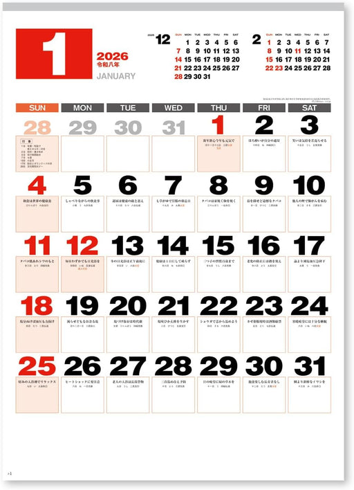 New Japan Calendar 2026 Wall Calendar Daily Wisdom Moji Monthly Table NK170
