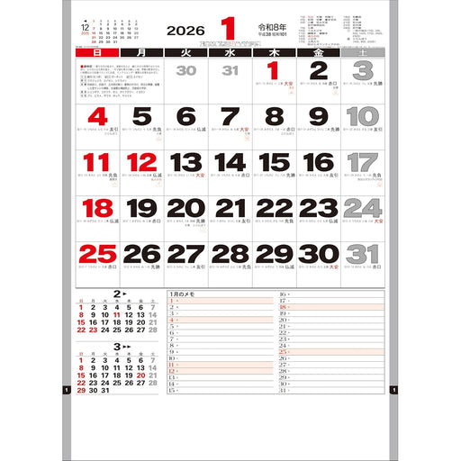 New Japan Calendar 2026 Wall Calendar Moji Monthly Table with Memo NK179